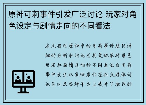 原神可莉事件引发广泛讨论 玩家对角色设定与剧情走向的不同看法