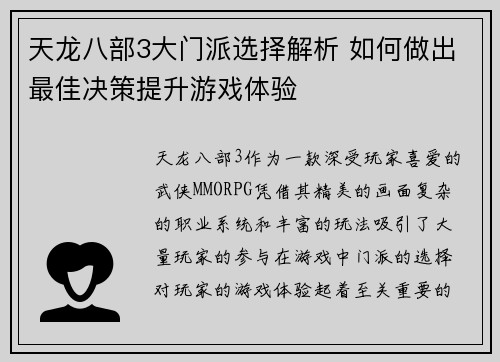 天龙八部3大门派选择解析 如何做出最佳决策提升游戏体验
